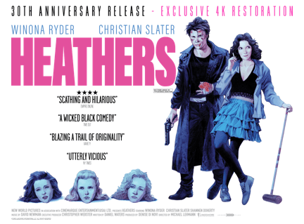 Directed by Michael Lehmann, Heathers pushed the teen comedy into dark and nightmarish territory and is distinguished by the career defining central performances of its stars Winona Ryder and Christian Slater.