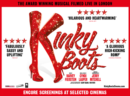 KINKY BOOTS THE MUSICAL, filmed live at the Adelphi Theatre in the heart of London’s West End, is strutting onto the big screen! With songs from Grammy and Tony award winning pop icon Cyndi Lauper, book by legendary Broadway playwright Harvey Fierstein (La Cage Aux Folles), and direction and choreography by Jerry Mitchell (Legally Blonde, Hairspray), the musical is based on the film written by Geoff Deane and Tim Firth.