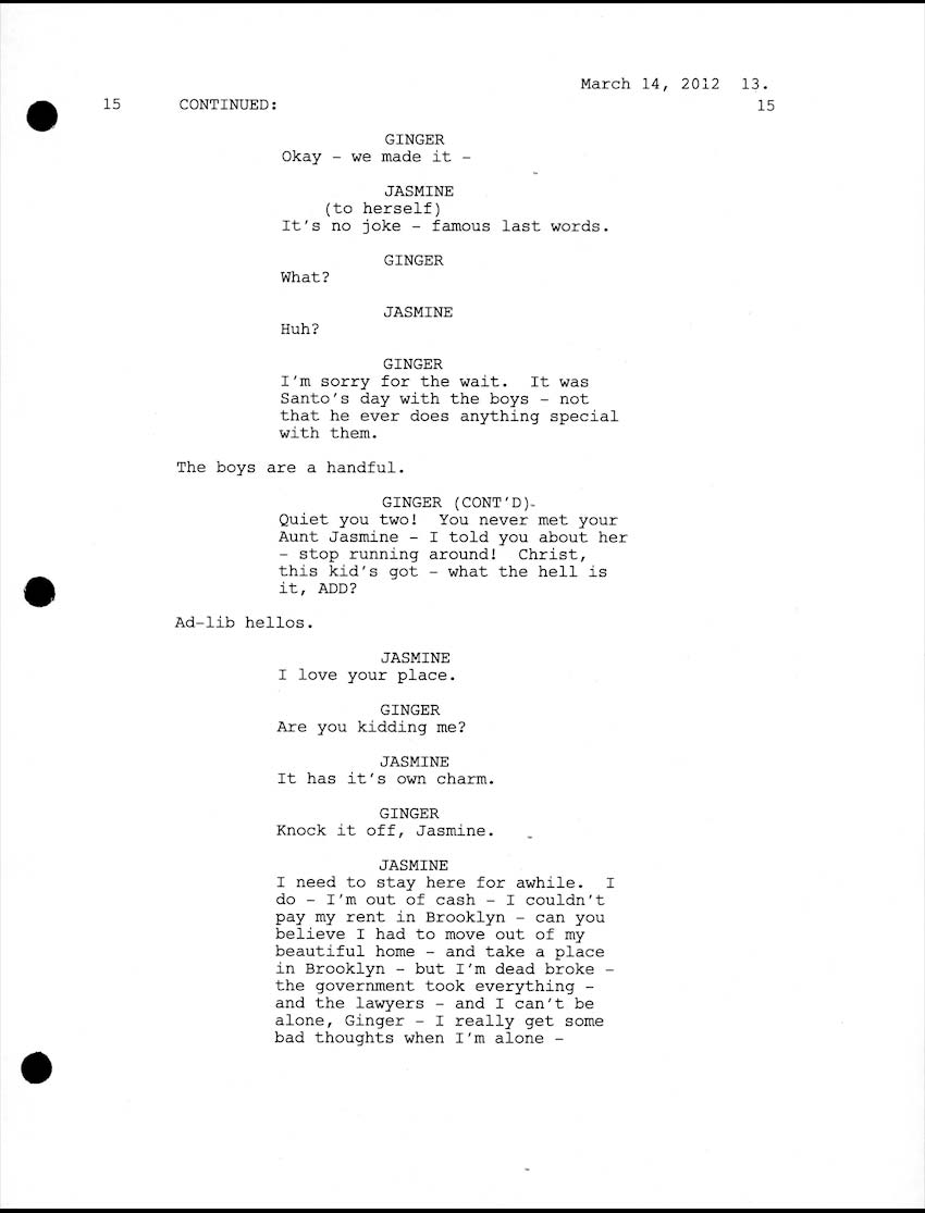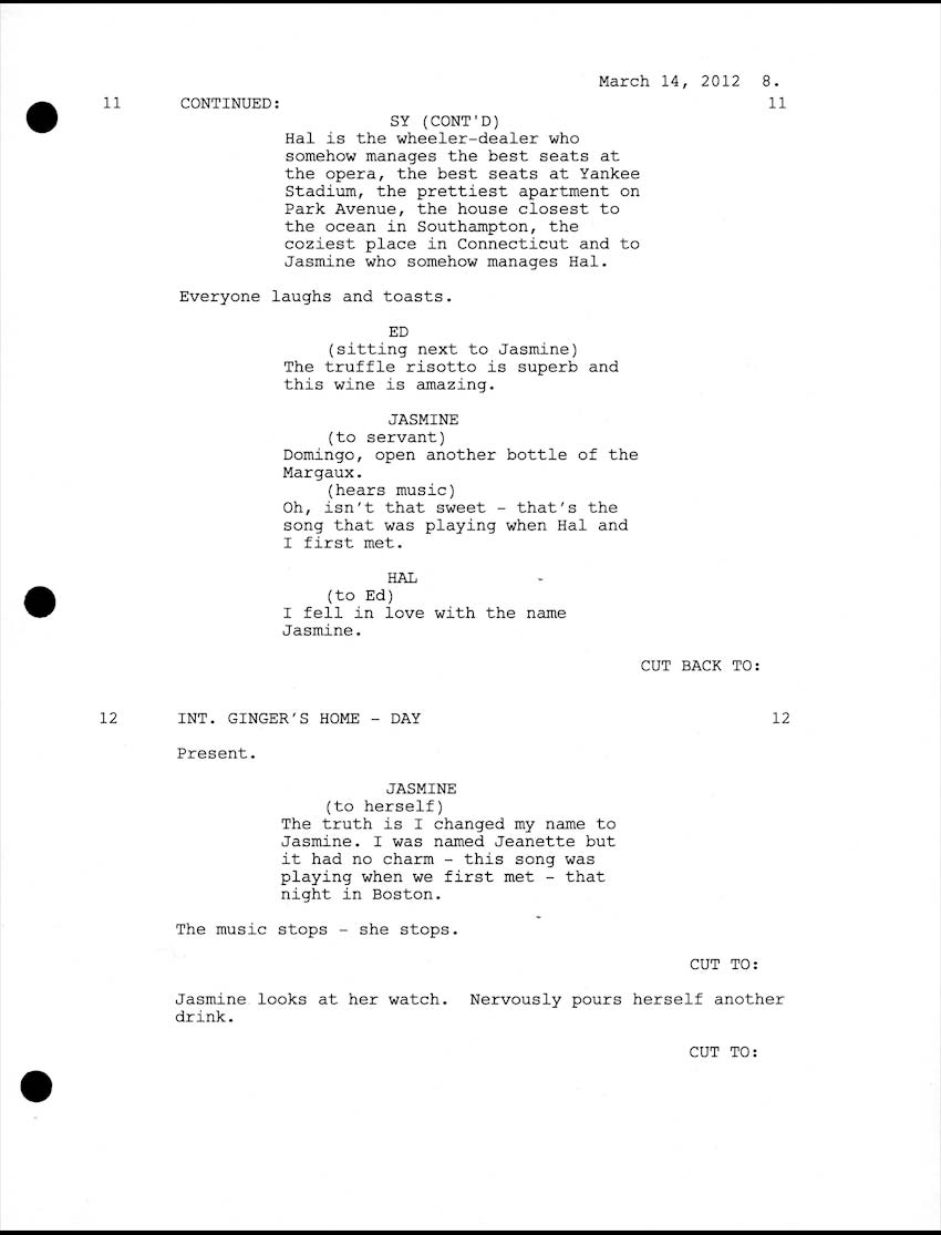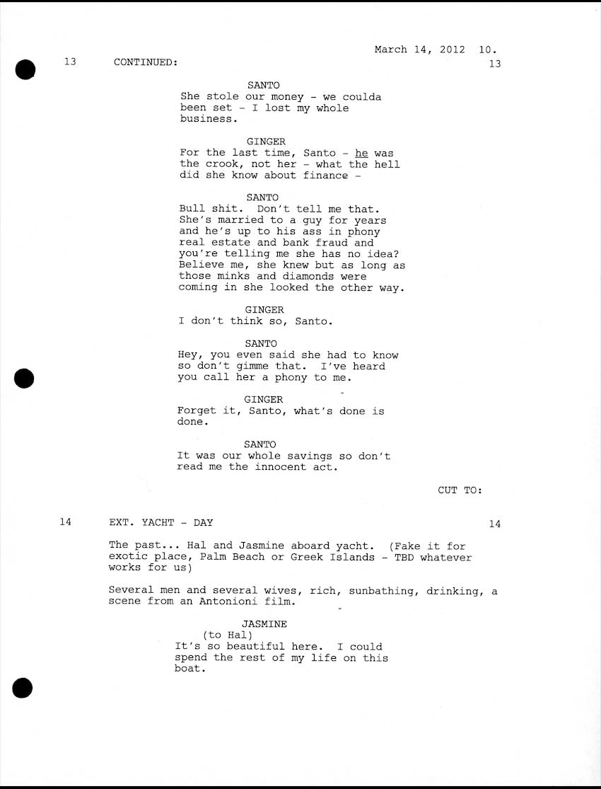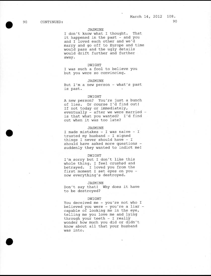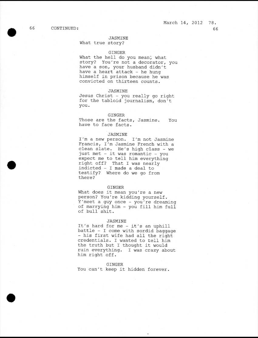 Jasmine arrives in San Francisco in a fragile mental state, her head reeling from the cocktail of anti-depressants she’s on. While still able to project her aristocratic bearing, Jasmine is emotionally precarious and lacks any practical ability to support herself. She disapproves of Ginger’s boyfriend Chili (Bobby Cannavale), who she considers another “loser” like Ginger’s ex-husband Augie (Andrew Dice Clay). Ginger, recognizing but not fully understanding her sister’s psychological instability, suggests that she pursue interior design, a career she correctly intuits that Jasmine won’t feel is beneath her. In the meantime, Jasmine begrudgingly accepts work as the receptionist in a dentist’s office, where she attracts the unwanted attentions of her boss, Dr. Flicker (Michael Stuhlbarg).