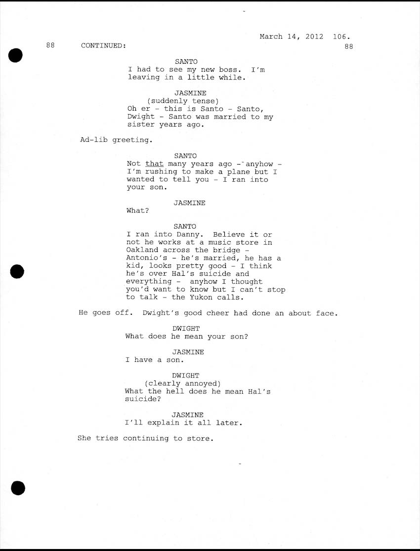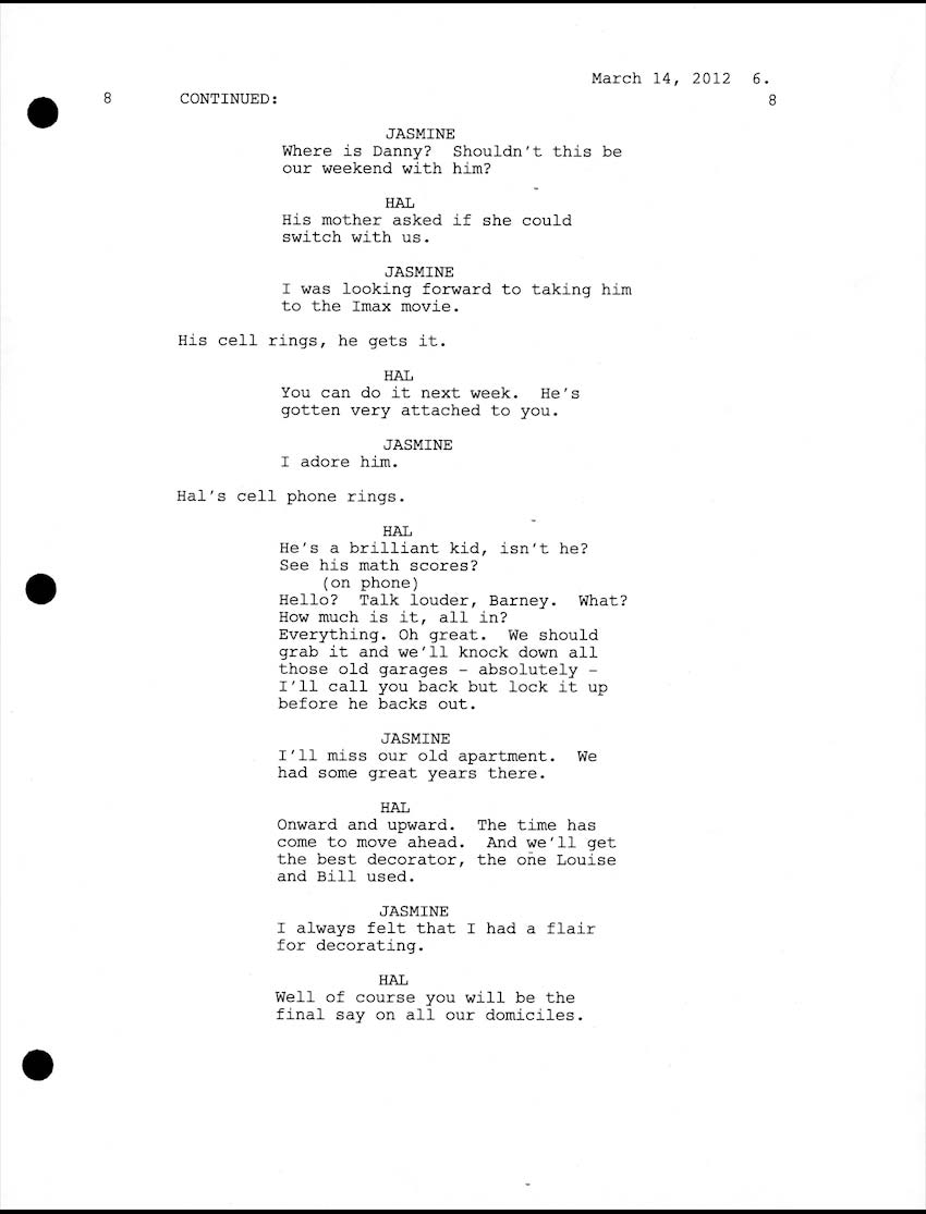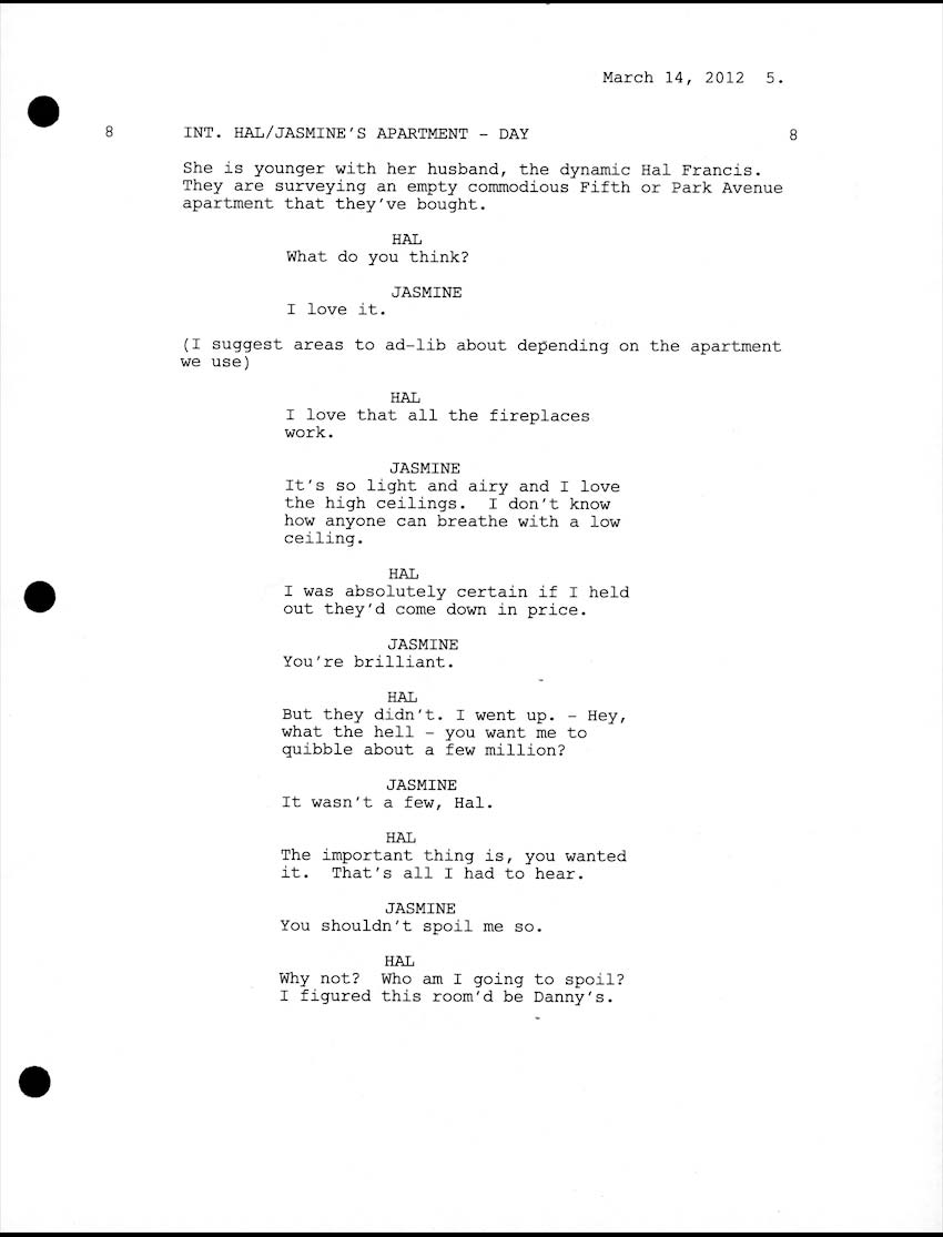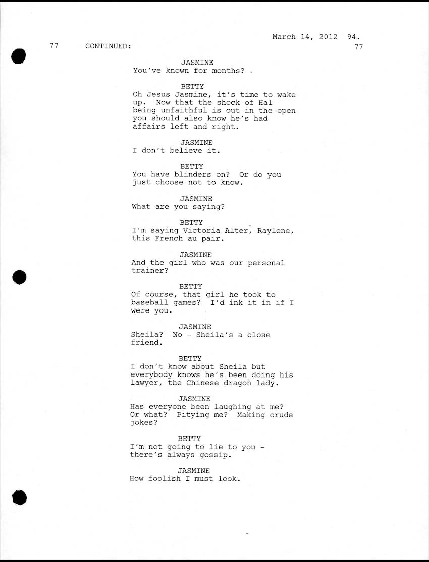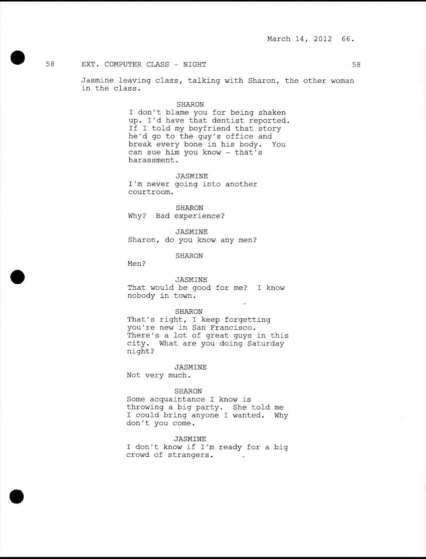 Jasmine arrives in San Francisco in a fragile mental state, her head reeling from the cocktail of anti-depressants she’s on. While still able to project her aristocratic bearing, Jasmine is emotionally precarious and lacks any practical ability to support herself. She disapproves of Ginger’s boyfriend Chili (Bobby Cannavale), who she considers another “loser” like Ginger’s ex-husband Augie (Andrew Dice Clay). Ginger, recognizing but not fully understanding her sister’s psychological instability, suggests that she pursue interior design, a career she correctly intuits that Jasmine won’t feel is beneath her. In the meantime, Jasmine begrudgingly accepts work as the receptionist in a dentist’s office, where she attracts the unwanted attentions of her boss, Dr. Flicker (Michael Stuhlbarg).
