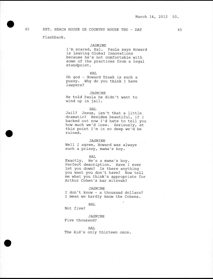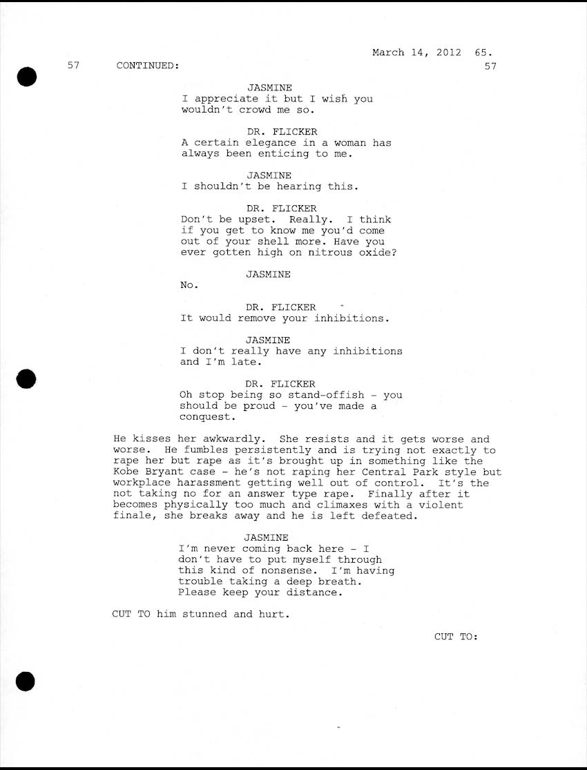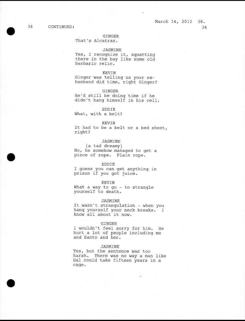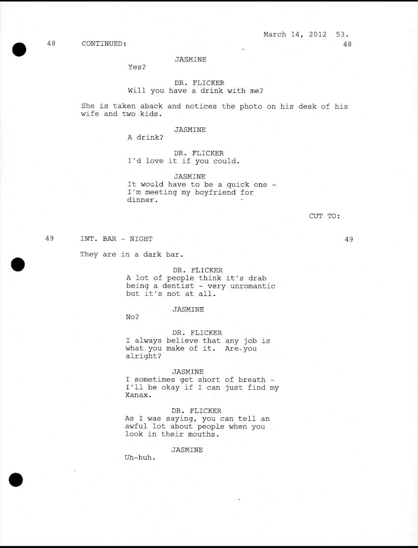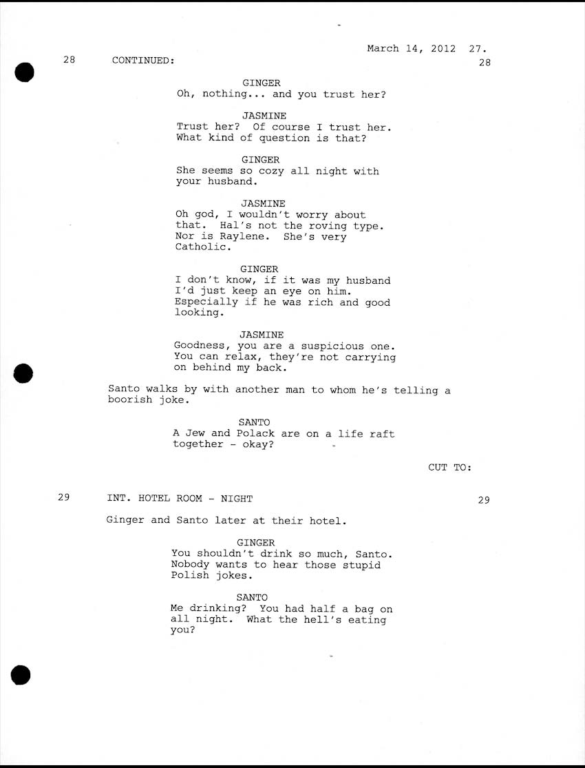 Jasmine arrives in San Francisco in a fragile mental state, her head reeling from the cocktail of anti-depressants she’s on. While still able to project her aristocratic bearing, Jasmine is emotionally precarious and lacks any practical ability to support herself. She disapproves of Ginger’s boyfriend Chili (Bobby Cannavale), who she considers another “loser” like Ginger’s ex-husband Augie (Andrew Dice Clay). Ginger, recognizing but not fully understanding her sister’s psychological instability, suggests that she pursue interior design, a career she correctly intuits that Jasmine won’t feel is beneath her. In the meantime, Jasmine begrudgingly accepts work as the receptionist in a dentist’s office, where she attracts the unwanted attentions of her boss, Dr. Flicker (Michael Stuhlbarg).