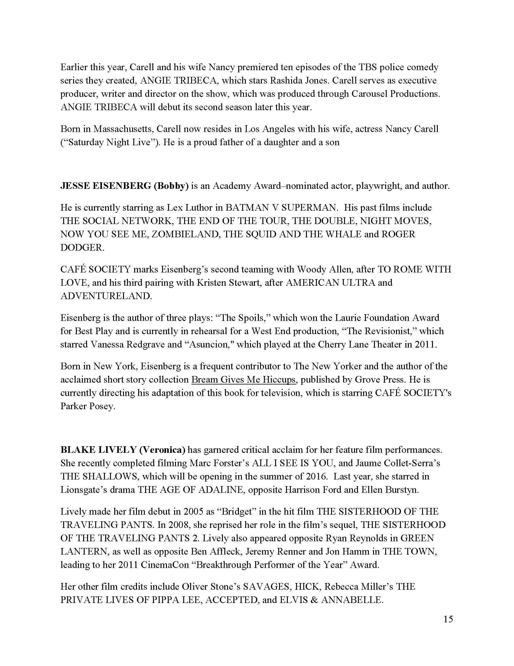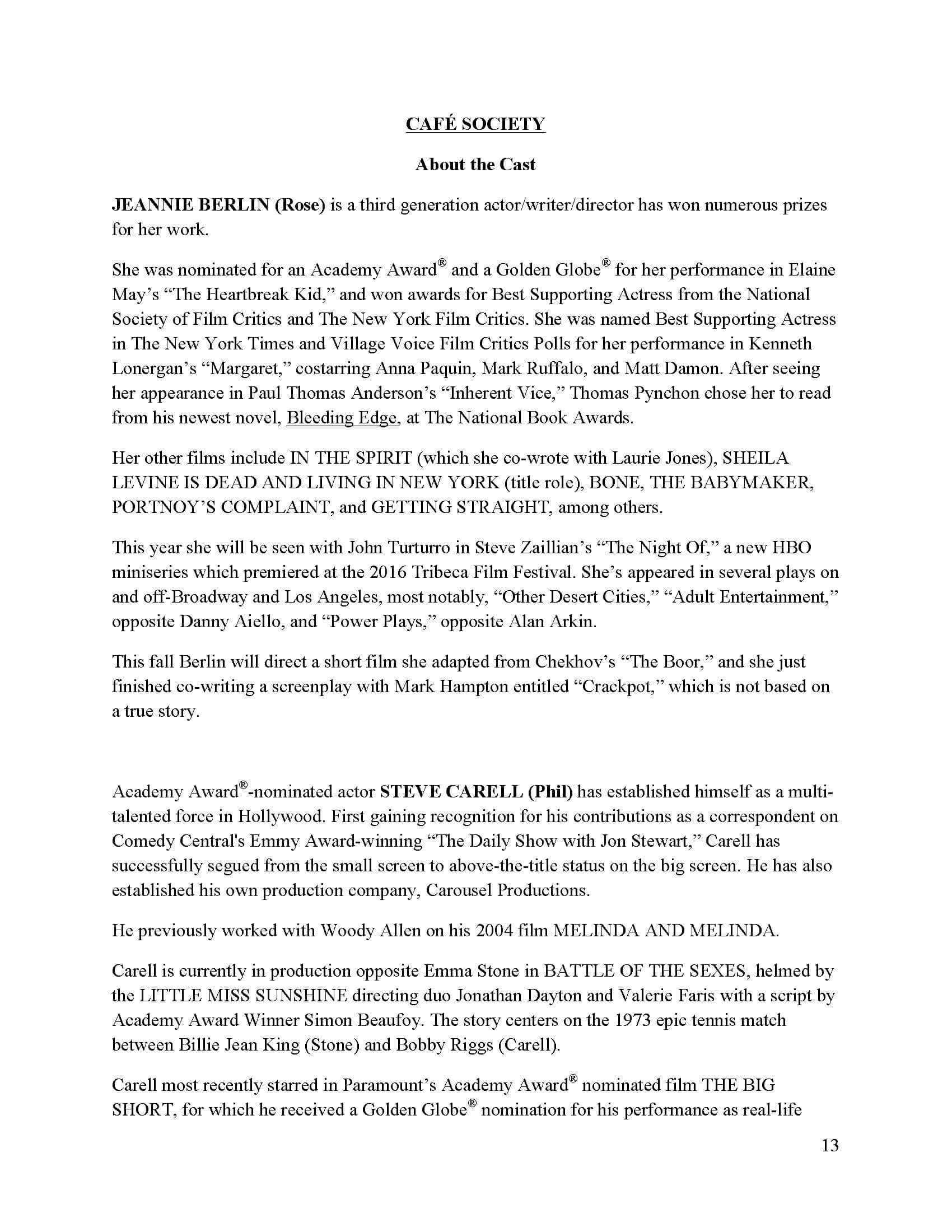 Poignant, and often hilarious, CAFÉ SOCIETY, a film with a novel’s sweep, takes us on a journey from pastel-clad dealmakers in plush Hollywood mansions, to the quarrels and tribulations of a humble Bronx family, to the rough-and- tumble violence of New York gangsters, to the sparkling surfaces and secret scandals of Manhattan high life.
