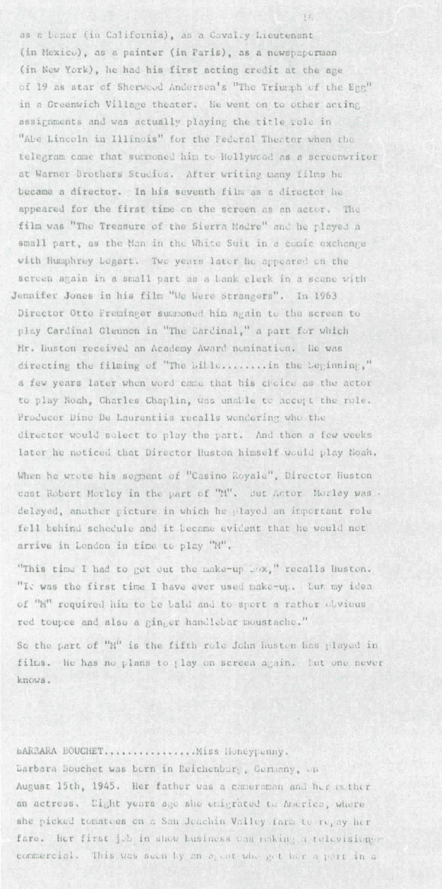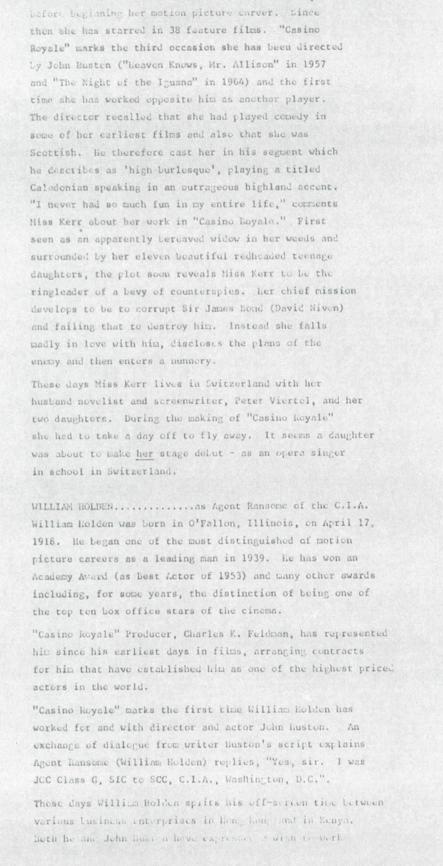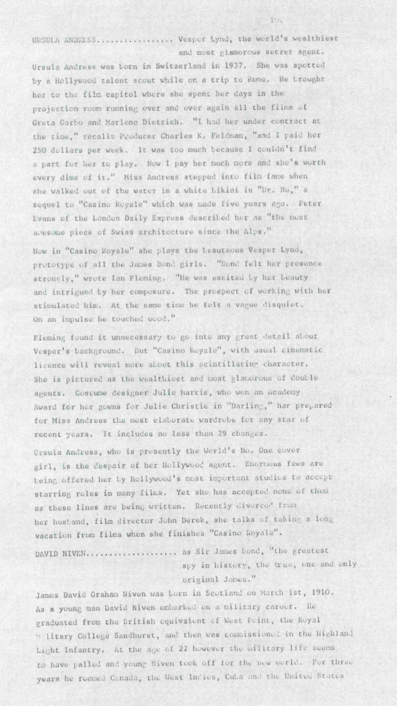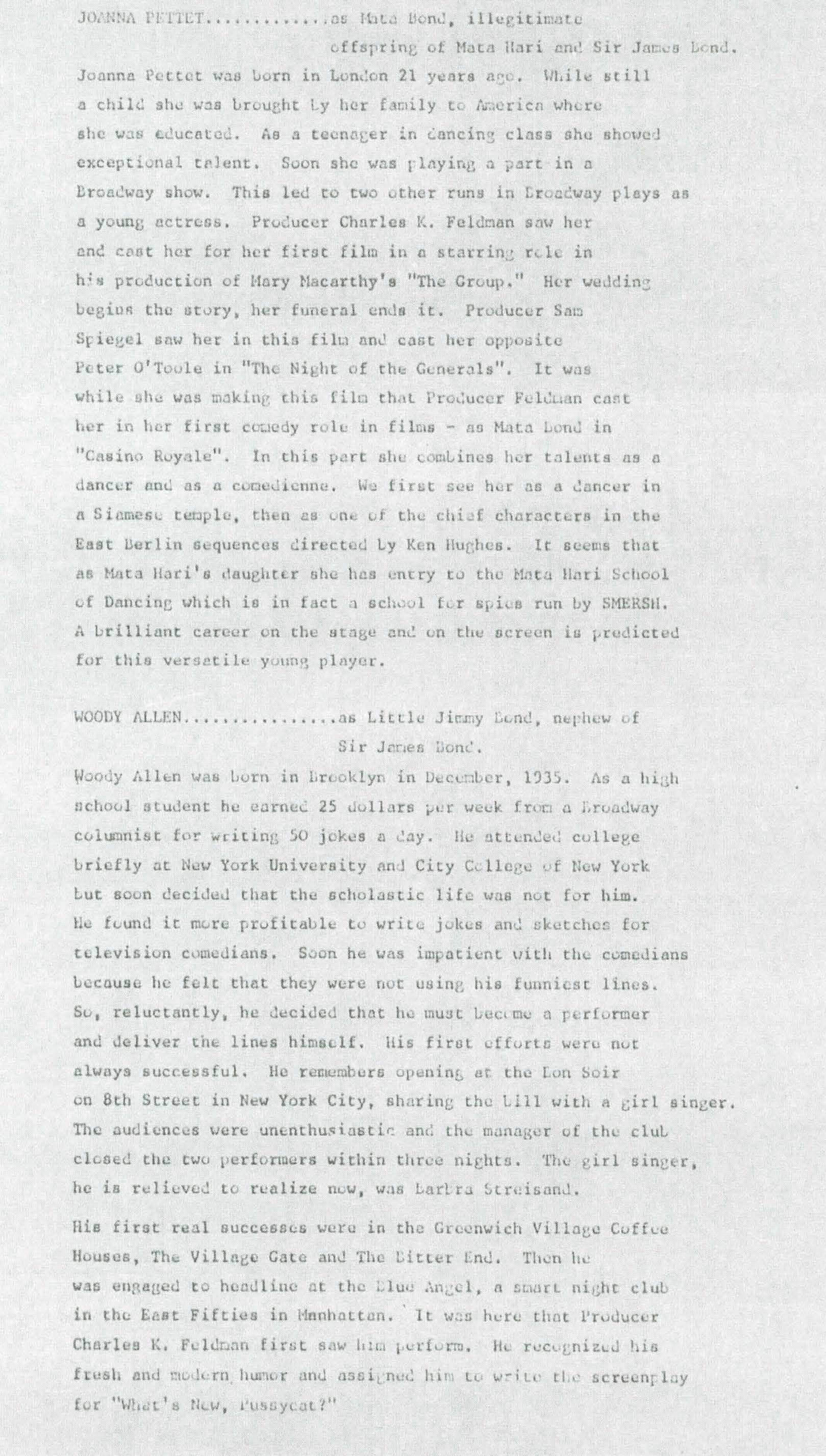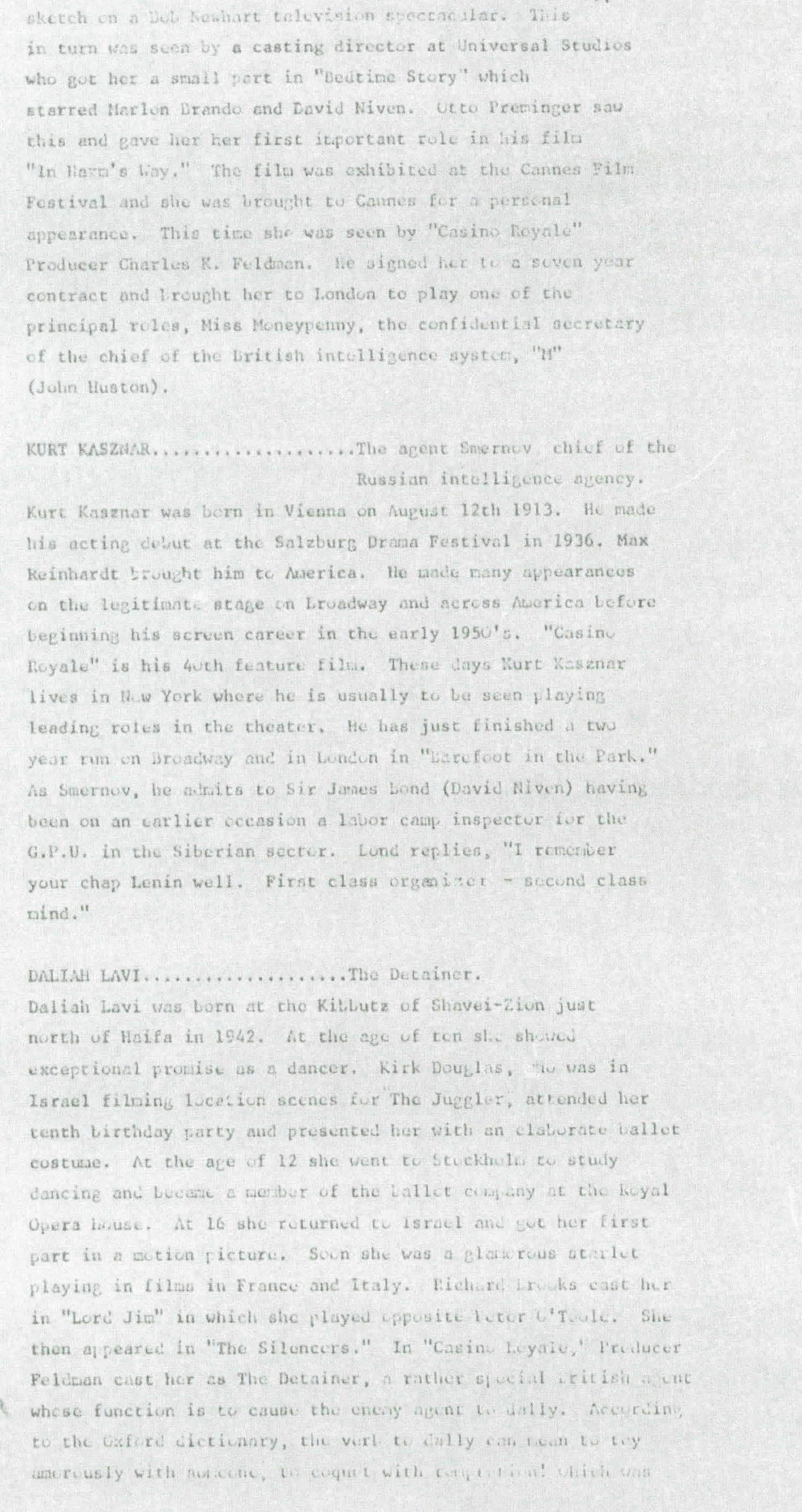 Back in London, Bond decides to designate all agents "James Bond" or "007'' to confuse the enemy. He reaches an agreement with Vesper Lynd, the richest spy in the world, and sets her to seduce Evelyn Tremble, inventor of a fool-proof system for winning at baccarat. Others co-opted at this time include Cooper, a muscle- man, and Bond's daughter, Mata Bond, his child by Mata Hari. Mata Bond goes to Berlin, foils an attempt by SMERSH to extract money from the major powers, and returns. Bond's plans for Tremble are put into effect when he and Vesper go to the Casino Royale so that he can beat Le Chiffre at baccarat and thus prevent SMERSH's attempts to replenish their finances at the tables.