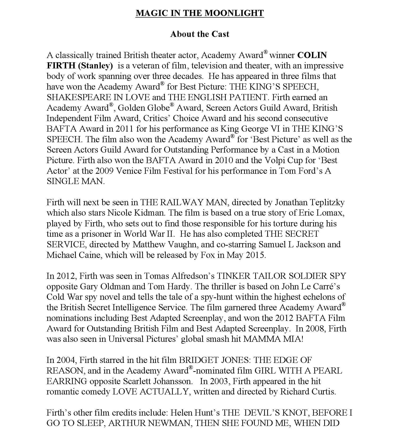 Set in the 1920s on the opulent Riviera in the south of France, Woody Allen’s MAGIC IN THE MOONLIGHT is a romantic comedy about a master magician (Colin Firth) trying to expose a psychic medium (Emma Stone) as a fake.