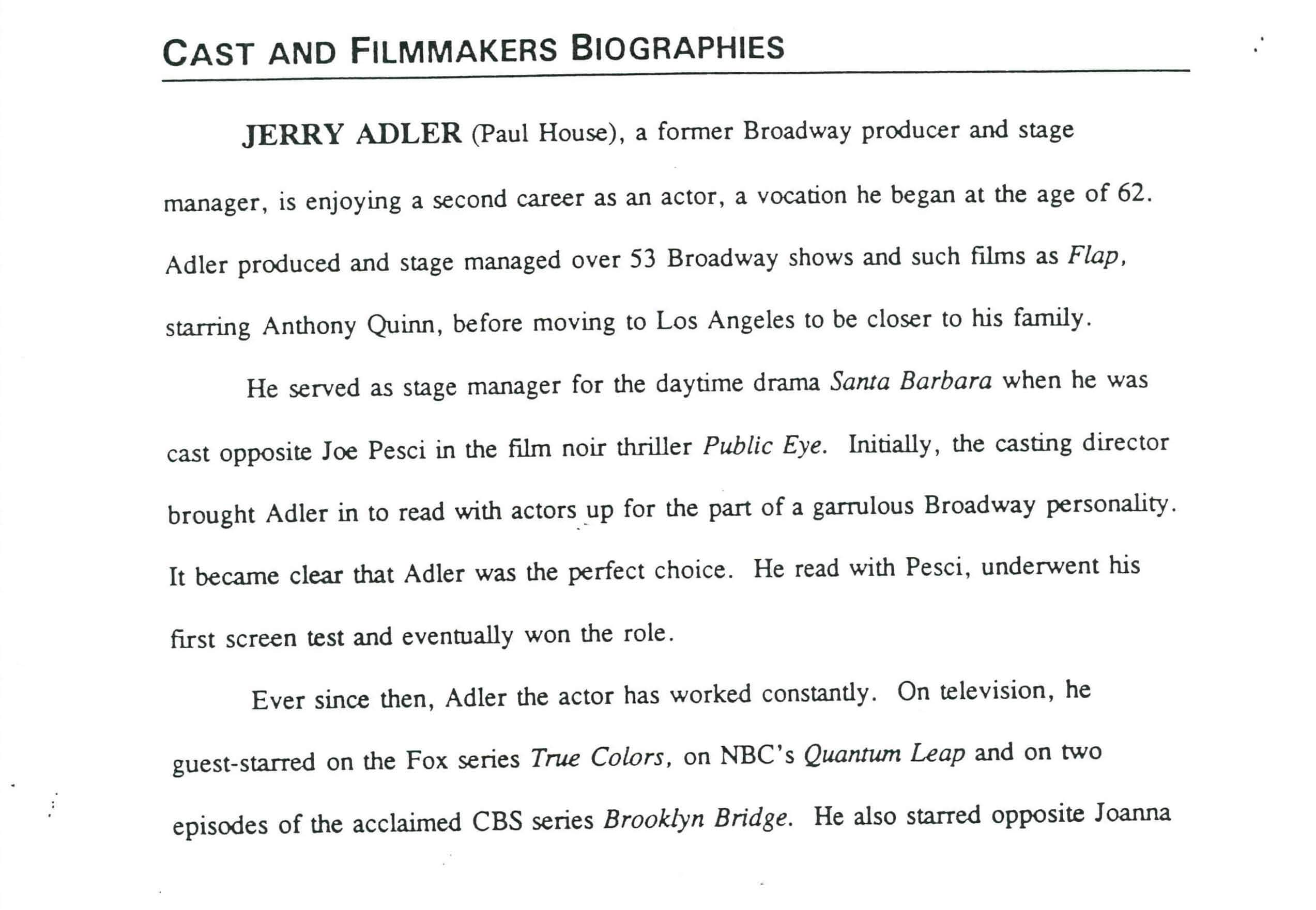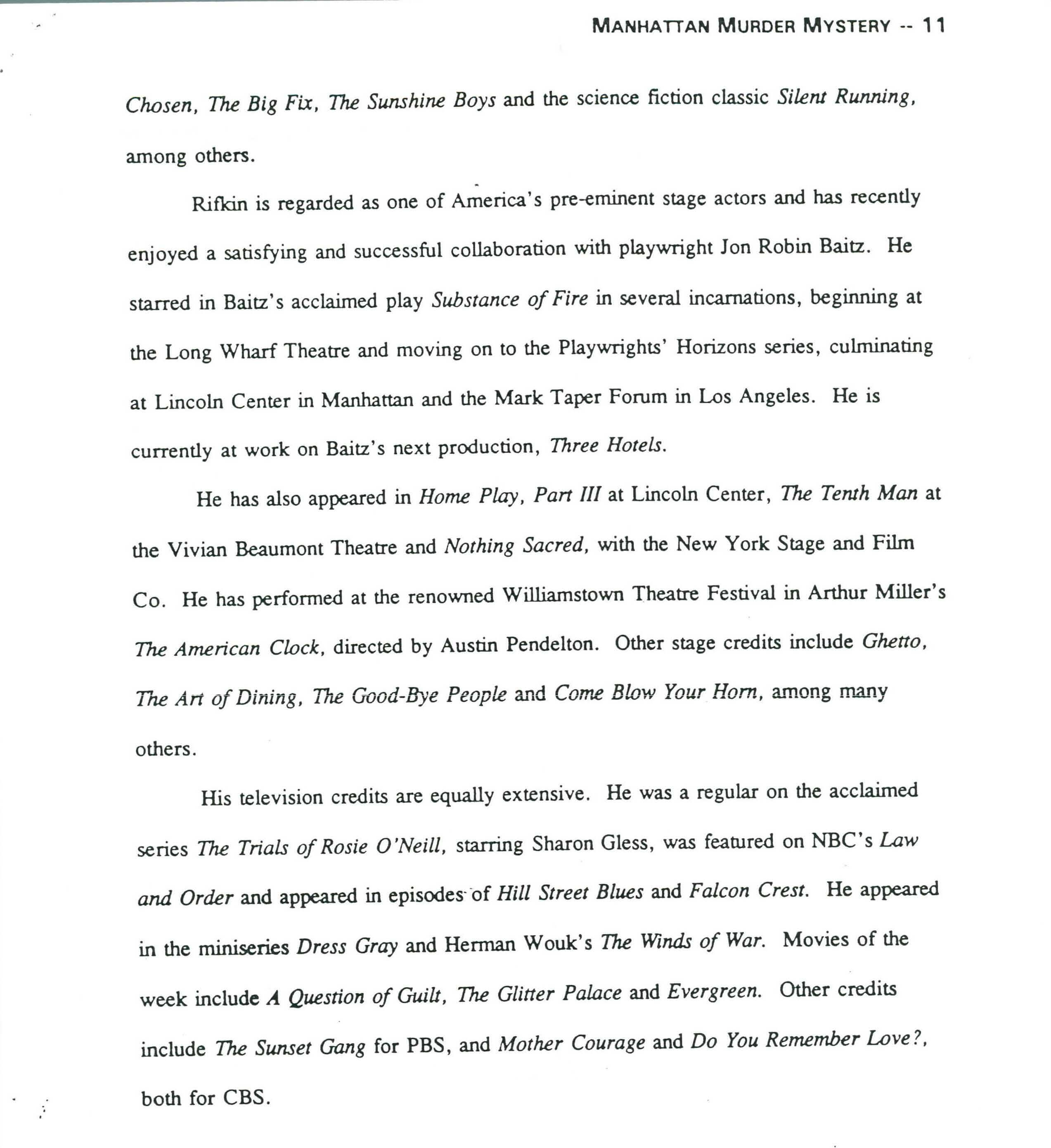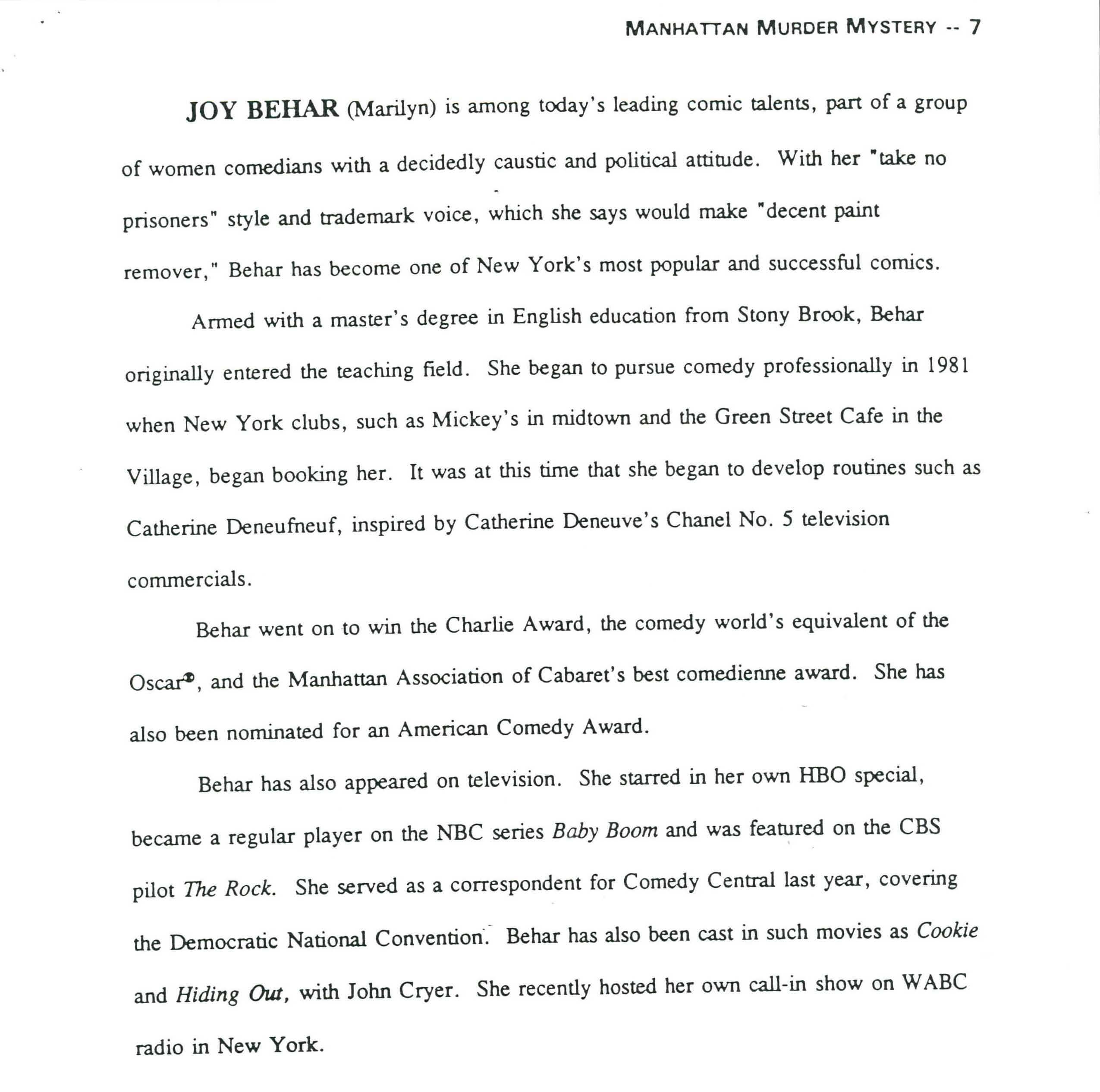 Huston returns the compliment, saying that Allen is "very exciting to work for." Ron Rifkin plays Sy, married to Marilyn (Joy Behar). Friends of the Liptons, Sy and Marilyn encourage their investigation, offering their own opinions and ideas and, importantly, their technological expertise. Jerry Adler portrays the mysterious neighbor, Paul House, who may be a murderer. A former Broadway producer and stage manager, Adler makes his second appearance in a film with MANHATTAN MURDER MYSTERY.