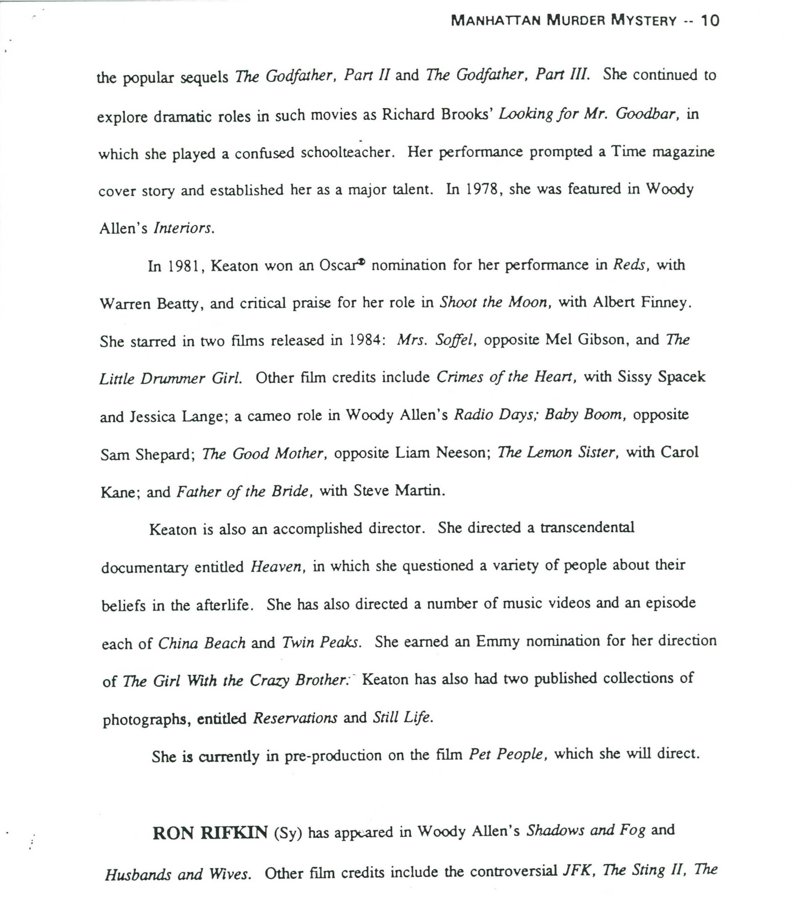 MANHATTAN MURDER MYSTERY, directed by Woody Allen from a screenplay he co-wrote with Marshall Brickman, is a contemporary comedy in which a husband and wife find themselves totally bewildered by a possible murder.