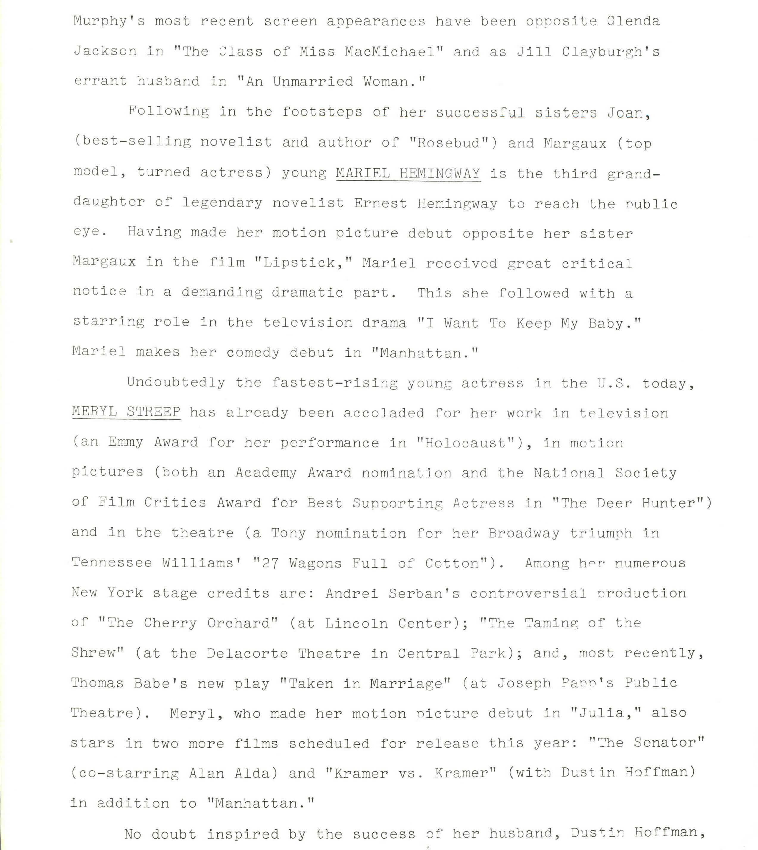 MANHATTAN is a 1979 American romantic comedy film directed by Woody Allen and produced by Charles H. Joffe. The screenplay was written by Allen and Marshall Brickman. Allen co-stars as a twice-divorced 42-year-old comedy writer who dates a 17-year-old girl (Mariel Hemingway) but falls in love with his best friend's (Michael Murphy) mistress (Diane Keaton). Meryl Streep and Anne Byrne also star.