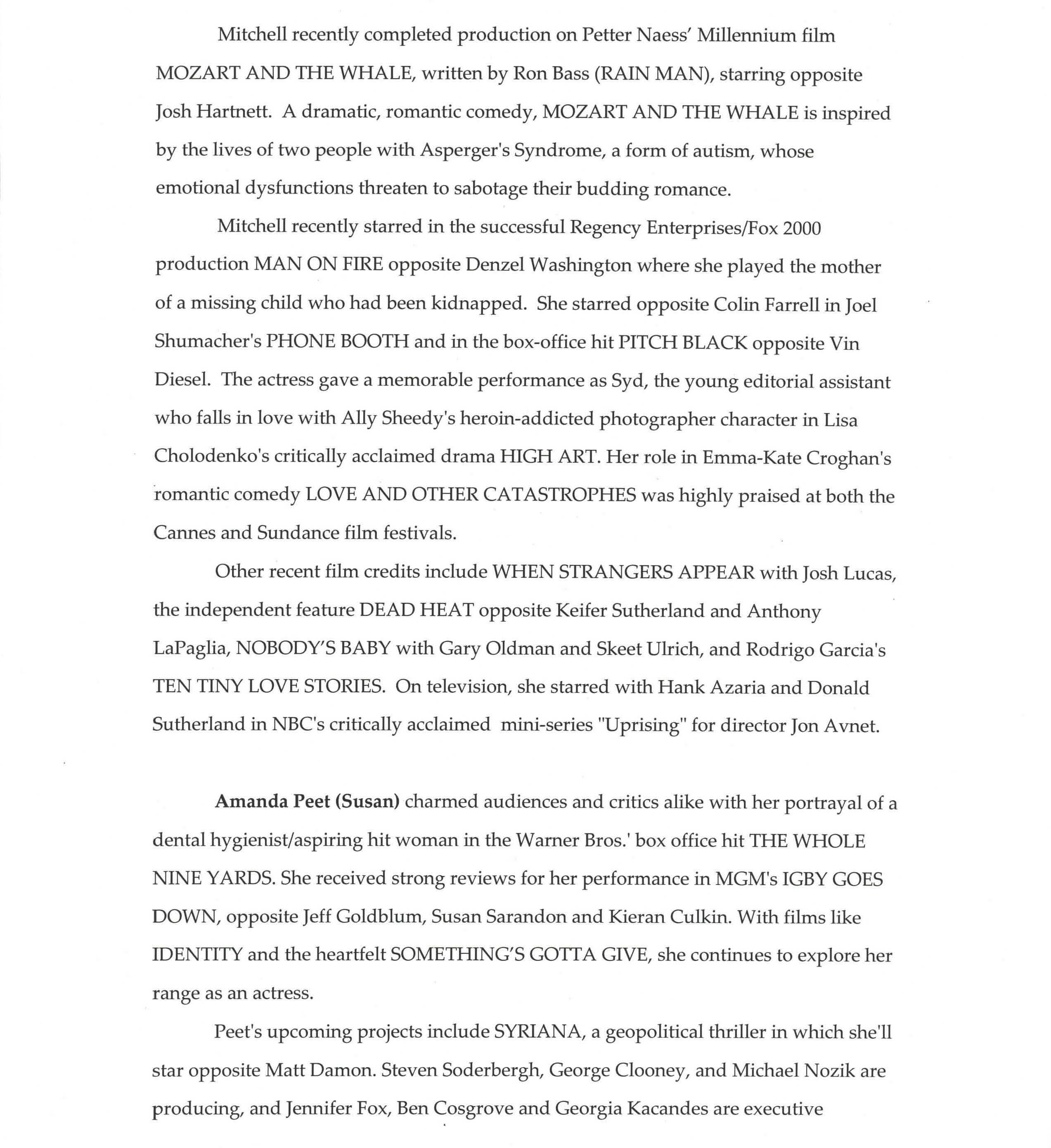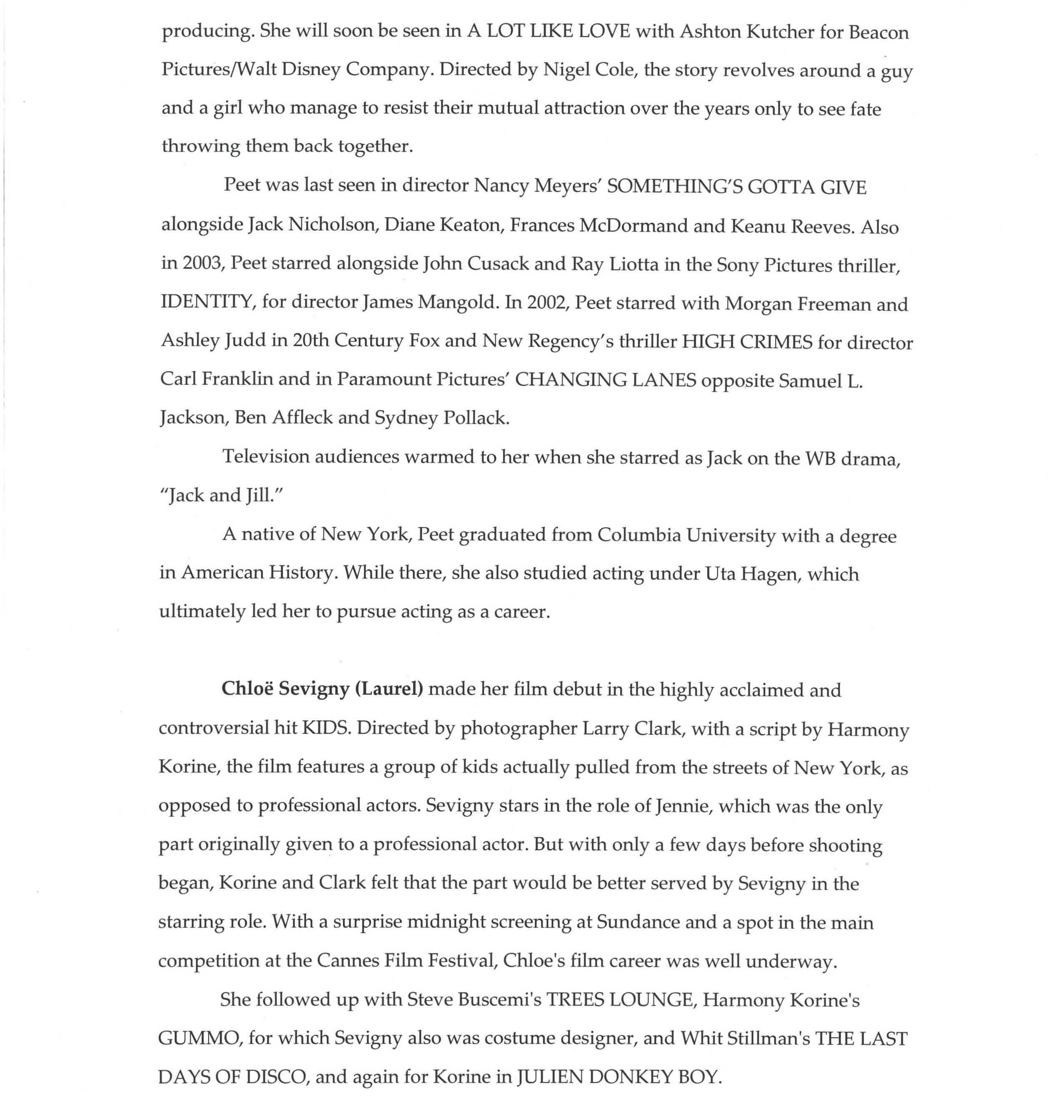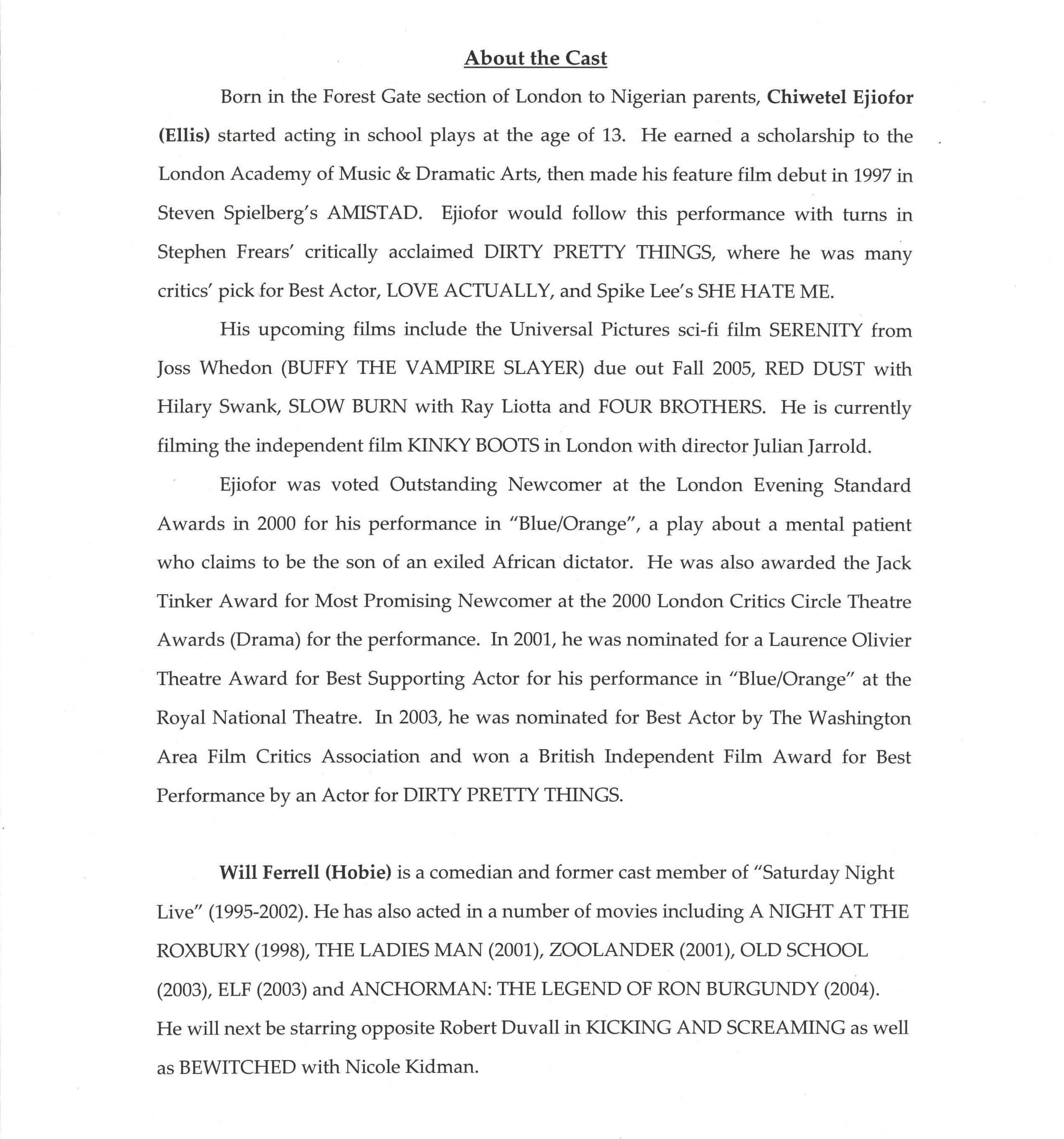 The Fox Searchlight Pictures Presentation MELINDA AND MELINDA is written and directed by Woody Allen and produced by Letty Aronson. Executive Producer is Stephen Tenenbaum. Co-executive producers are Jack Rollins and Charles H. Joffe . Co-producer is Helen Robin. The creative team includes Director of Photography Vilmos Zsigmond, A.S.C., Production Designer Santo Loquasto, Editor Alisa Lepselter and Costume Designer Judy Ruskin Howell. The film stars Chiwetel Ejiofor, Will Ferrell, Jonny Lee Miller, Radha Mitchell, Amanda Peet, Chloe Sevigny, and Wallace Shawn.