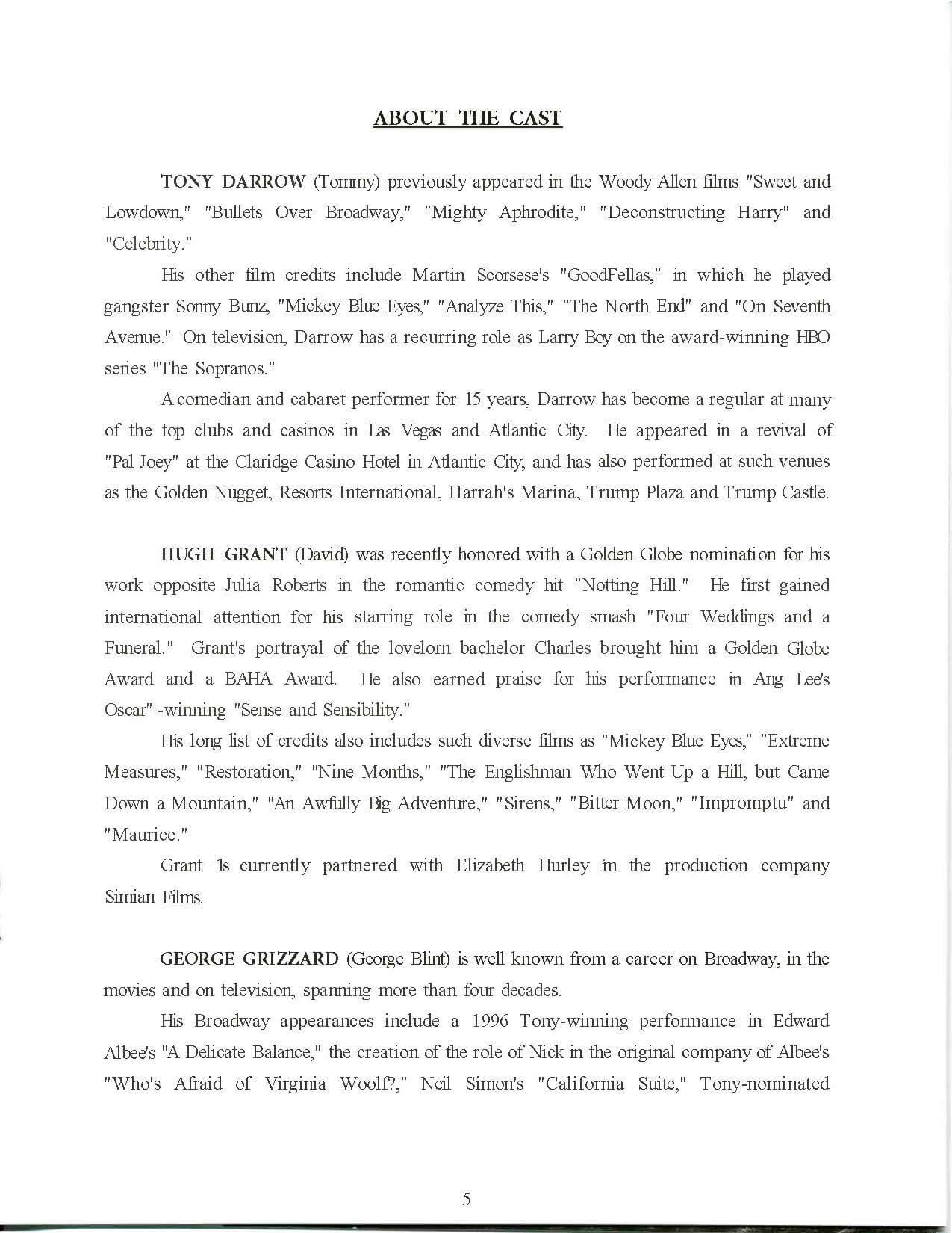 For the role of David, Allen cast Hugh Grant, whose undeniable charm in romantic comedies like FOUR WEDDINGS AND A FUNERAL and the more recent hit NOTTING HILL, have made him an audience favorite. "He is a great comedian," Allen says. "His role required someone with an acute sense of timing, and he pulled it off perfectly."