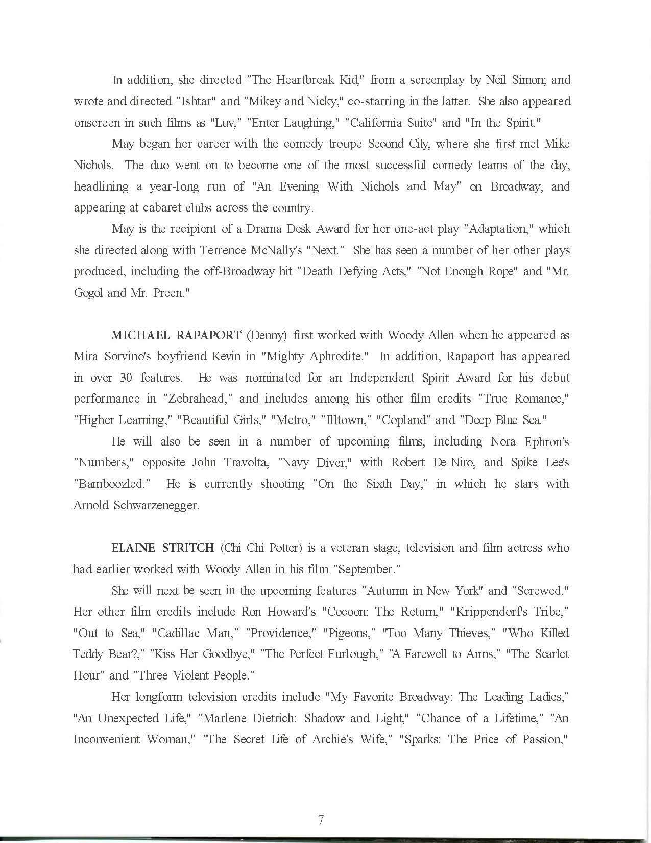 Allen comments, "It was wonderful to work again with Tracey; she is a genius. In fact, I worked with two female geniuses in this film, Tracey and Elaine May. I hadn't really worked with Elaine before, but I have known her slightly for years, and she is one of the great talents."
